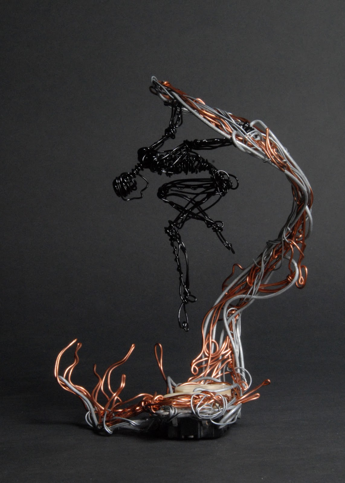 Using metal wire as his medium, Baltimore-based photographer and artist Devin Mack explores the principles of drawing as expanded into three-dimensional art. His work ranges from pieces that suggest the look of a loose gesture drawing to more tightly-wound, intricate representations of his subjects.